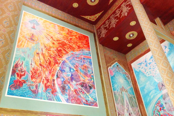 The temple at Doi Saket is said to have been built in the year 1112. The legend is that the Lord Buddha had come to Doi Saket for a short time, and was visited by naka whom he offered his hair for the purpose of worship. Shortly after he is said to have dissapeared, and this is the reason for the location of the temple. Thai artist, “Khun Chaiwat Wannanon” began painting the interior of the temple walls with spiritual Buddhist murals in the early 1990s. It took over 4 years for the murals to be completed. This is something that is unique to the temple at Doi Saket. Most Buddhist temples in Thailand do not have any modern art in a modern style.