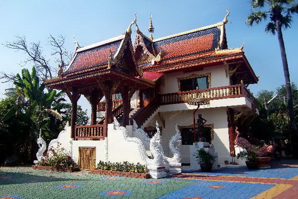 The temple at Doi Saket is similar to the Doi Suthep Temple, yet smaller in size. The entrance to the temple (as is the case at Doi Suthep) has a steep set of stairs leading to the temple. The most prominent feature of the Doi Saket Temple is the giant golden sitting Buddha (Phra Buddha Pathimakorn), visible from the road leading to the temple. The interior walls of the temple are decorated with modern spiritual murals, painted by Khun Chaiwat Wannanon. Normally modern art is not featured in Buddhist temples in Thailand, so this is somewhat unique to Doi Saket. There is also a monastic school located on the grounds of the temple.