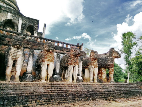 - Wat Chang Lom : This temple is located behind the wall of Srisatchanalai. It’s well-known for the Lanka principle pagoda. You will see it being surrounded with many stone poles. Beside, you will want to go around and see some other remained parts of the temple, including the vihara.